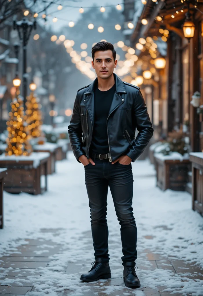 For a Christmas Party Outfit for Men with an urban edge, this is an ideal option. The classic black leather jacket makes a bold statement, while the simplicity of the black jeans keeps things balanced. You can add a dark-colored turtleneck or graphic tee to complete the look.