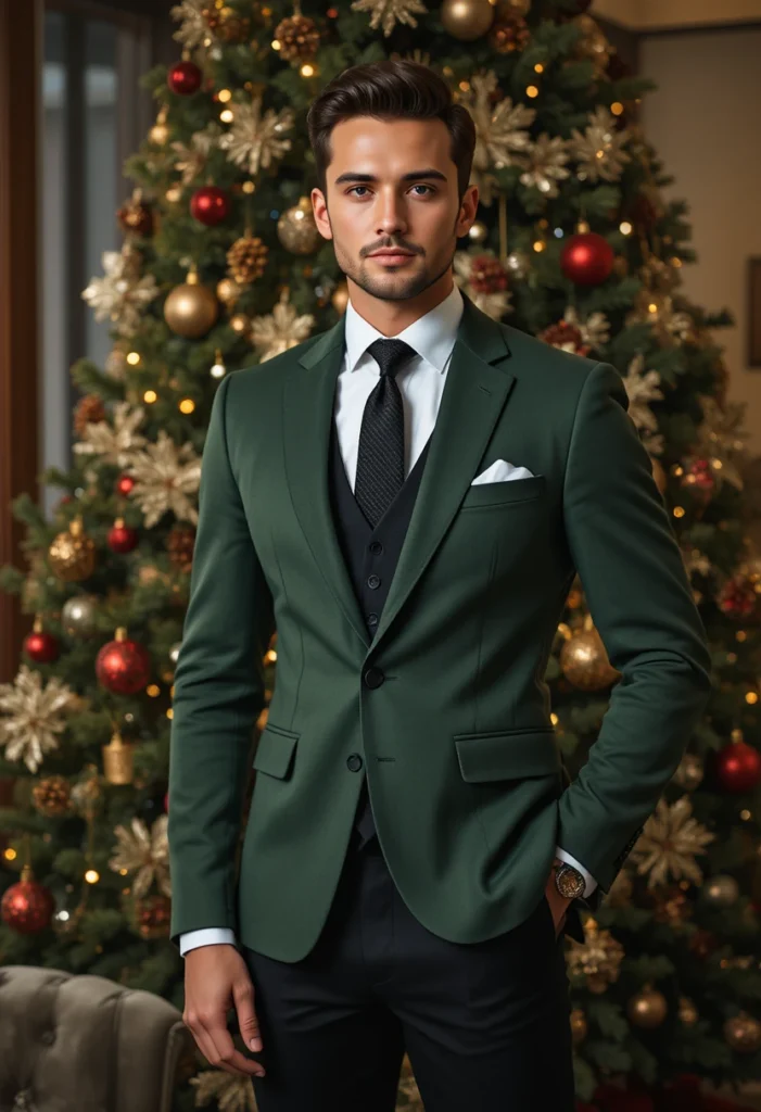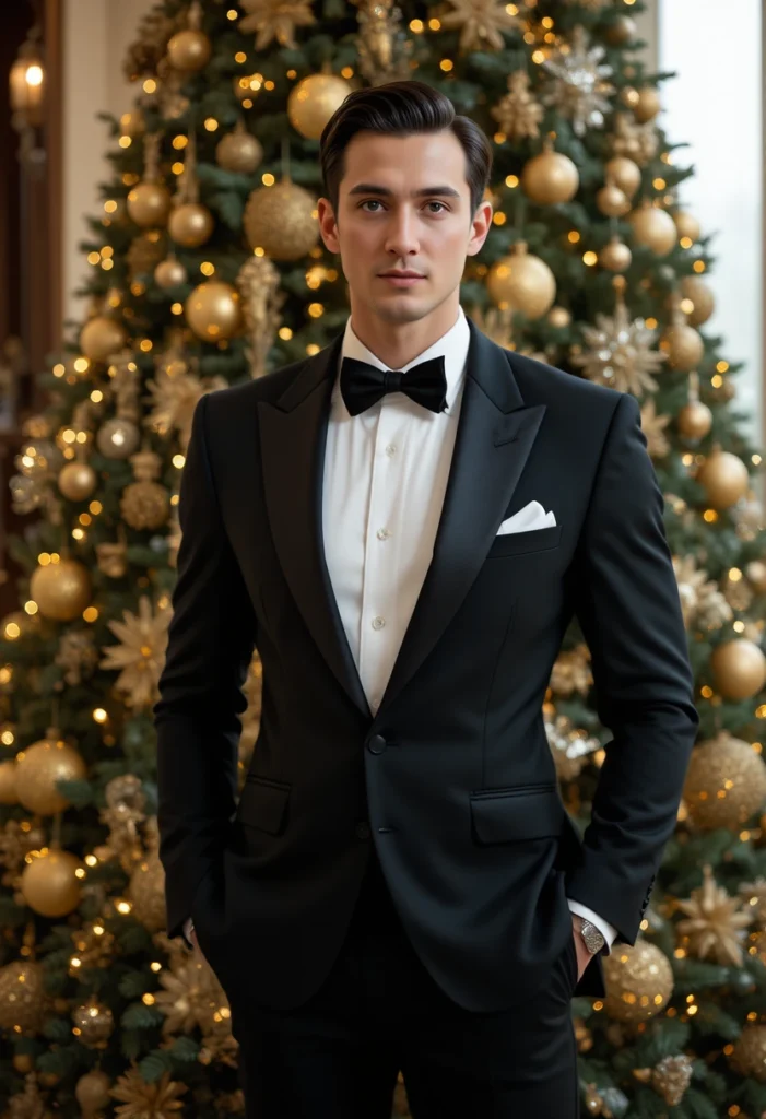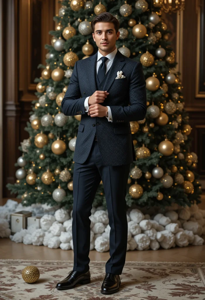 A classic black tuxedo is the ultimate choice for any formal Christmas celebration. There’s something undeniably chic about a tuxedo—it exudes a level of sophistication and refinement that’s perfect for holiday parties.