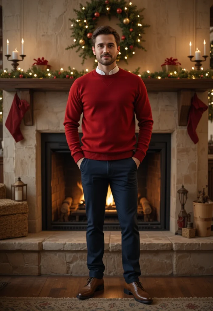 A red cashmere sweater paired with navy chinos offers an elevated yet comfortable look for any Christmas party. The soft, luxurious feel of the sweater is balanced by the tailored chinos, creating a sophisticated yet casual vibe. This is a great choice for a semi-formal event or a holiday dinner with friends or family.