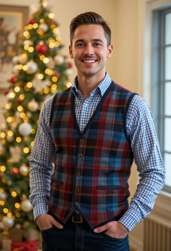 A plaid vest paired with a dress shirt is a great way to inject some personality into your Christmas party look while keeping things sophisticated. The plaid pattern is classic and festive, and the tailored vest adds a sharp, polished finish. Perfect for a semi-formal holiday celebration, this look ensures you stand out in the best possible way.