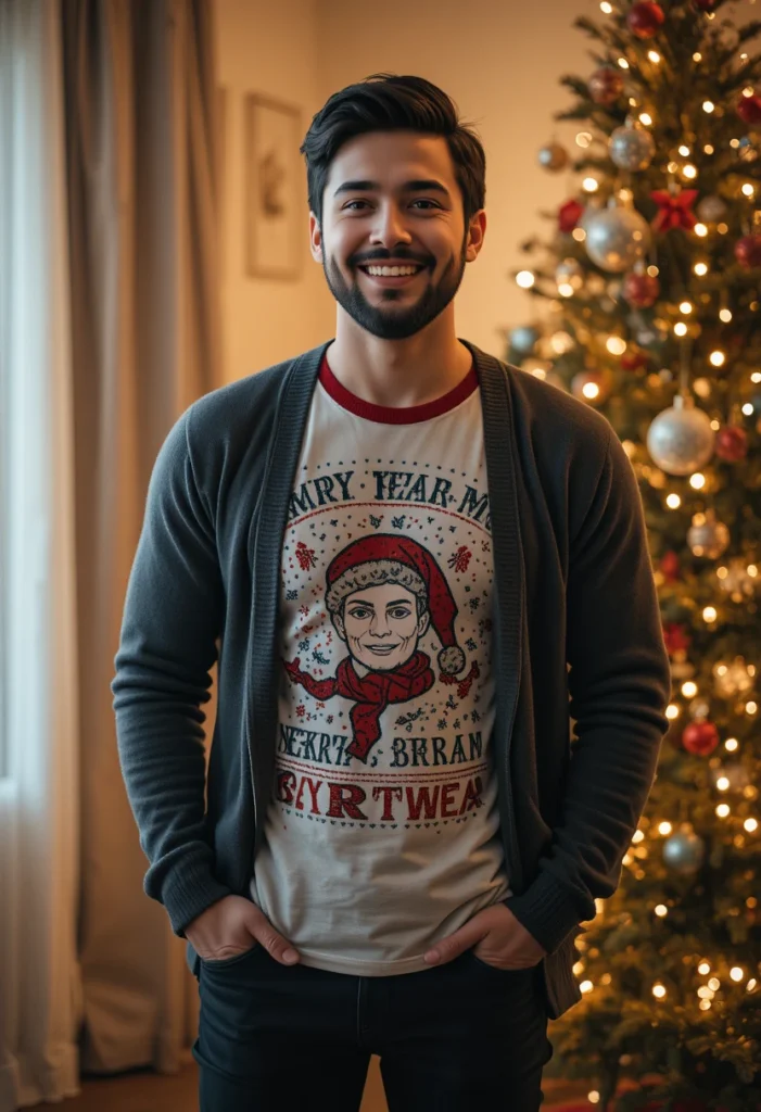 For a more relaxed yet fun Christmas outfit, a holiday-themed graphic t-shirt paired with a cardigan is a great option. Whether it’s a simple holiday message or a quirky design, the graphic tee brings some humor and lightheartedness to the celebration. The cardigan adds an extra layer of warmth and sophistication, making this outfit perfect for a casual yet festive Christmas gathering.