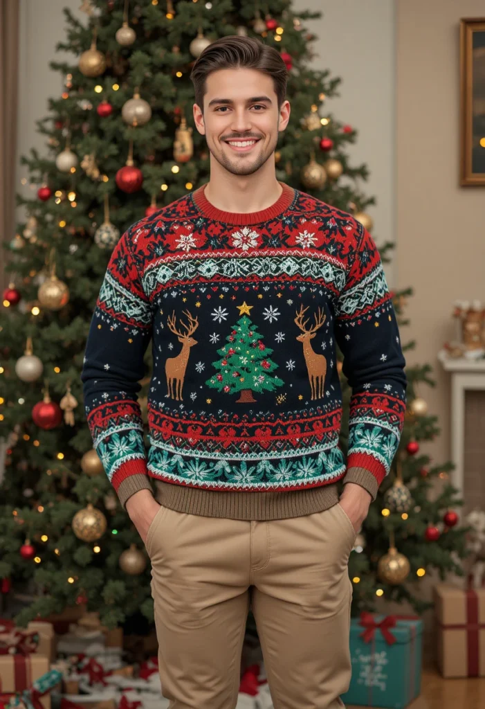 For a more relaxed yet festive look, a festive sweater paired with chinos is a great choice for Christmas parties. A sweater with a Christmas-themed pattern—such as snowflakes, reindeer, or holiday stripes—brings the holiday spirit into the mix.