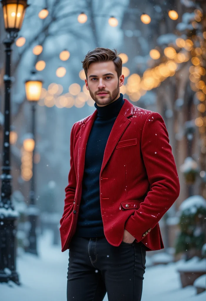 This look is perfect for more formal Christmas parties, such as a gala or an upscale cocktail event. The deep red or green hue of the blazer brings in the festive spirit while maintaining a refined, dashing appearance.