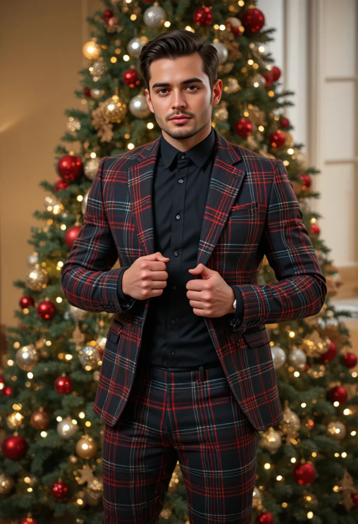 A plaid suit paired with a black dress shirt offers a stylish yet bold alternative to a traditional suit for Christmas parties. The plaid pattern adds personality and visual interest, while the black shirt creates a sophisticated contrast.