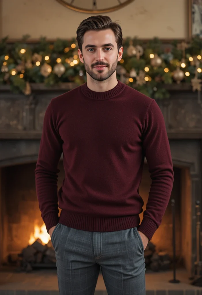 A burgundy cashmere sweater paired with grey wool trousers creates a refined yet cozy look for any Christmas gathering. The deep burgundy color of the sweater adds a touch of holiday elegance without being overly flashy.