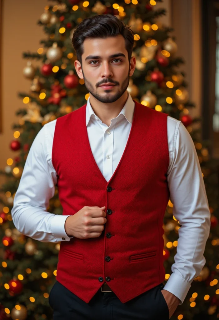 A white dress shirt paired with a red vest is a classic and festive look for those who want to stand out without overdoing it. The white shirt provides a clean and fresh foundation, while the red vest injects a festive pop of color. This is a great option for semi-formal Christmas parties or festive dinner dates where you want to stay stylish and comfortable.