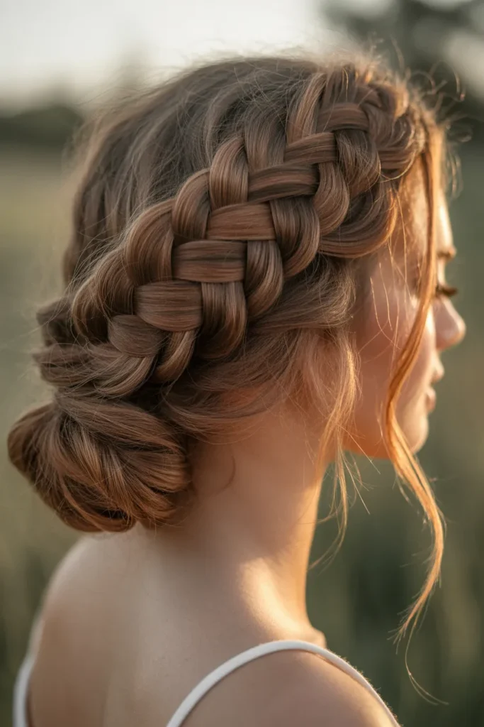 This style works beautifully for medium to long hair and can be adapted for all hair textures. For curly hair, it adds a wonderful texture to the braids, while for straight hair, the look has an ethereal, clean finish. The braided crown is effortlessly romantic, making it perfect for boho-chic bridesmaids.