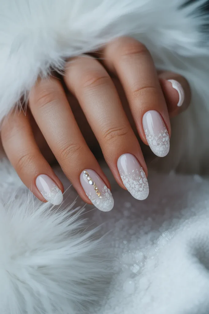 28. White Nails with Snowy Texture and Rhinestones