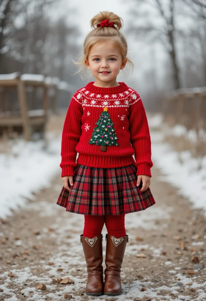 This look is perfect for a snowy winter day, whether you’re attending a Christmas party, visiting Santa, or simply enjoying some holiday fun at home. Your child will feel both festive and comfortable, and the plaid skirt adds a playful touch to the cozy sweater. Add a pair of knee-high boots to complete the outfit for a chic, wintery look.