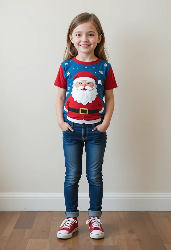 For a more laid-back look, a Santa graphic tee paired with jeans is an easy and stylish choice. The graphic tee features a cute, fun illustration of Santa Claus, reindeer, or Christmas trees, adding an element of whimsy to the outfit. Combine it with a pair of comfortable jeans or leggings and sneakers for an active yet festive look.
