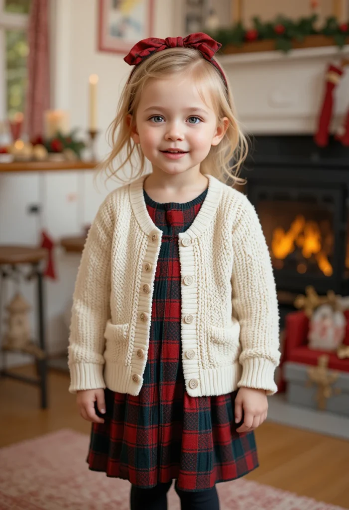 A tartan dress paired with a soft cardigan is a perfect look for the fall-to-winter transition. The tartan pattern, with its festive reds, greens, and blacks, screams Christmas cheer, while the cardigan adds a cozy layer to keep your child warm in cooler weather. This look works beautifully for family gatherings, holiday dinners, or attending Christmas church services.