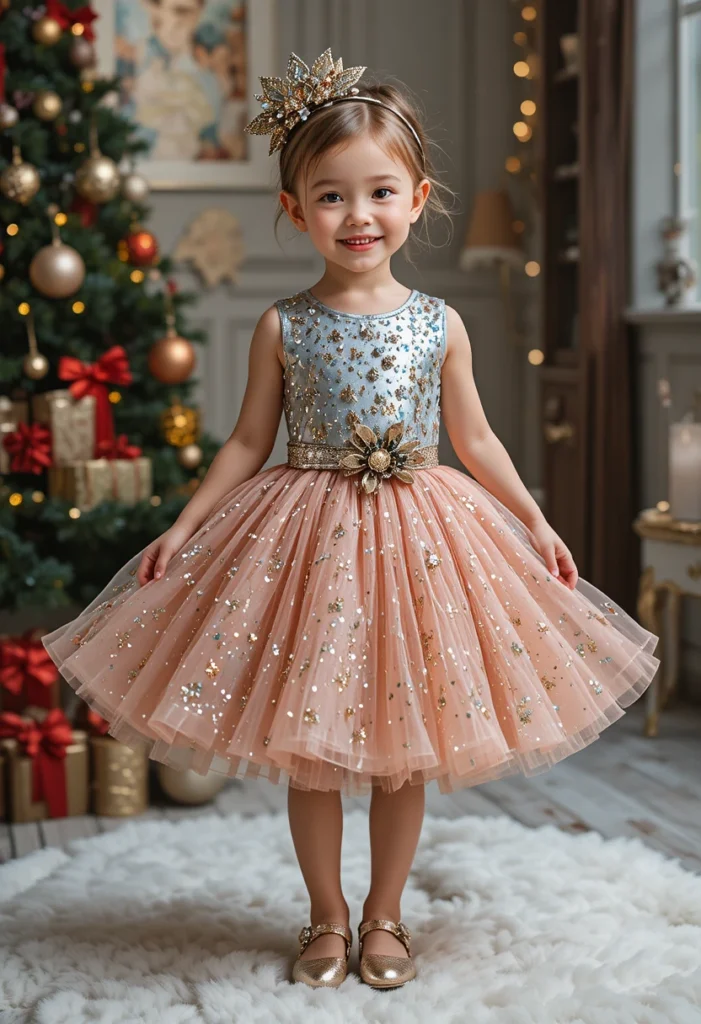 For a more formal Christmas celebration, a sparkling Christmas dress paired with a fluffy tutu skirt is the way to go. The dress could feature metallic gold or silver tones, sequins, or festive details like snowflakes and stars, while the tutu skirt adds a fun, voluminous flair that your child will love twirling in.