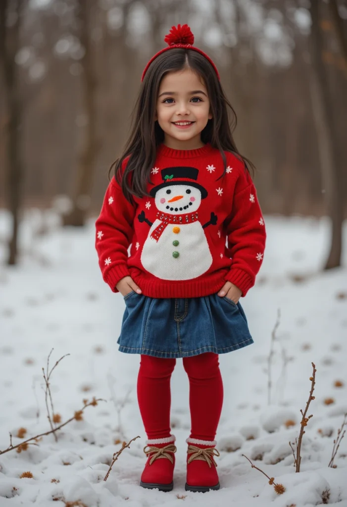 A snowman sweater paired with a cute denim skirt is a perfect option for a Christmas photo shoot. The sweater features a playful snowman design, with soft colors like white, blue, and red, creating a festive yet stylish look. Pair it with a denim skirt and tights for a mix of fun and sophistication.