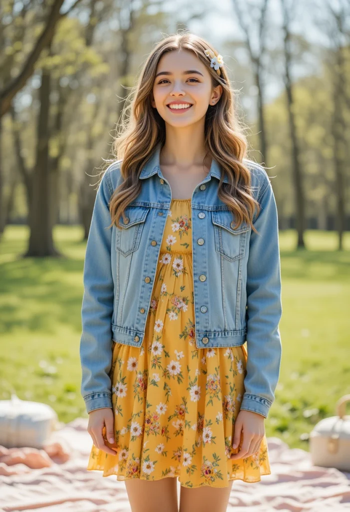 A denim jacket layered over a floral sundress never goes out of style! It’s the go-to outfit for spring picnics or casual dates. Pair with sneakers or low-heeled sandals for a relaxed yet polished vibe. Add a small handbag or a flower hair clip to complete your sunny-day look.