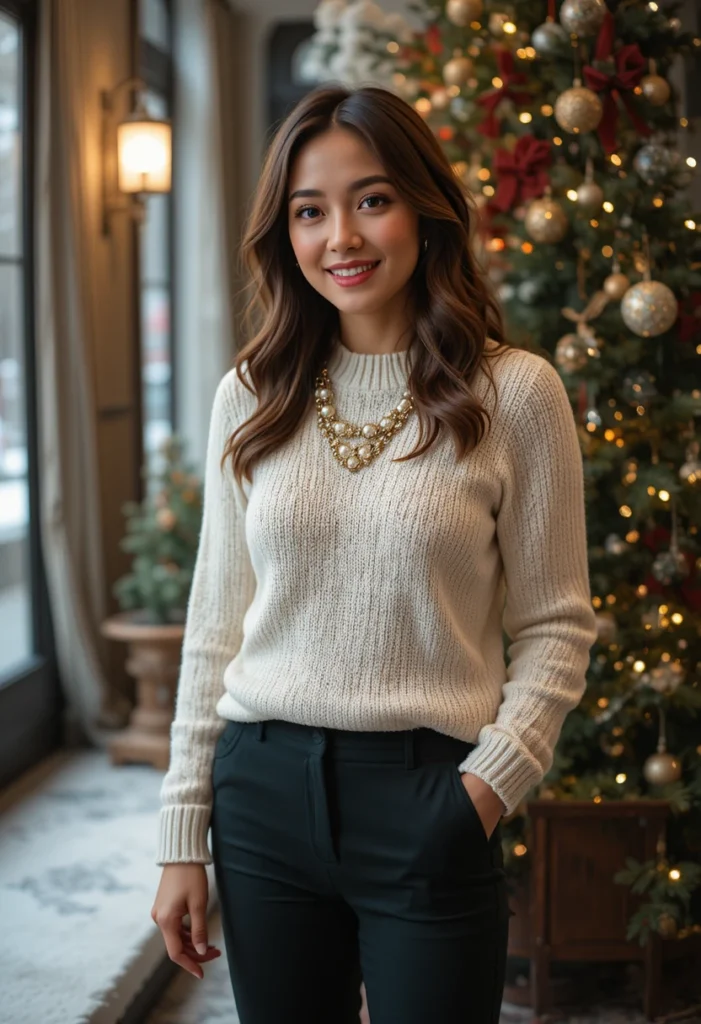 Pearl-embellished sweaters are becoming a modern Christmas classic, mixing softness with a touch of luxury. The pearls add an elegant sparkle while still keeping the outfit cozy and winter-friendly. Pair your sweater with tailored trousers in black, cream, or deep green for a clean and sophisticated silhouette. This combination strikes the perfect balance between dressy and comfortable.