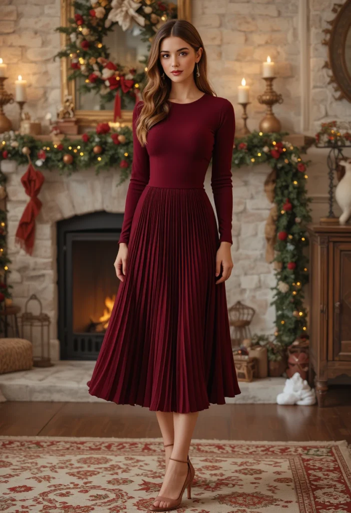 A burgundy pleated skirt is one of the most beautiful and feminine pieces you can wear for Christmas. The color instantly brings festive warmth, while the pleats add movement and elegance.