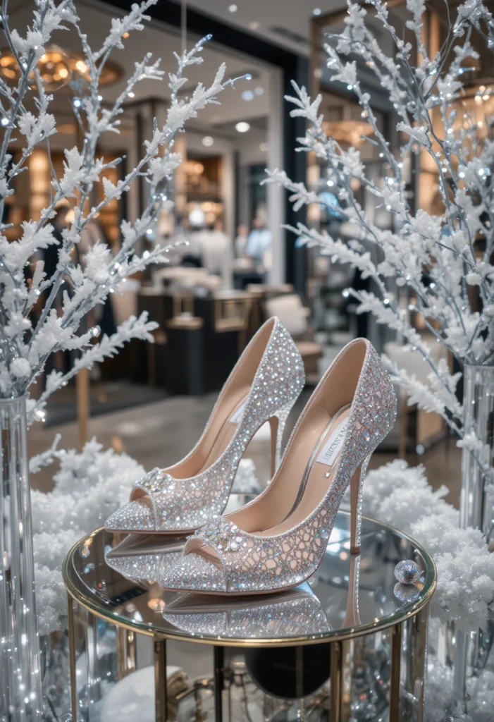 The shine catches the light beautifully in photos and makes your outfit party-ready instantly. If you want a classy Christmas vibe without wearing sequins, crystal heels are your best option.