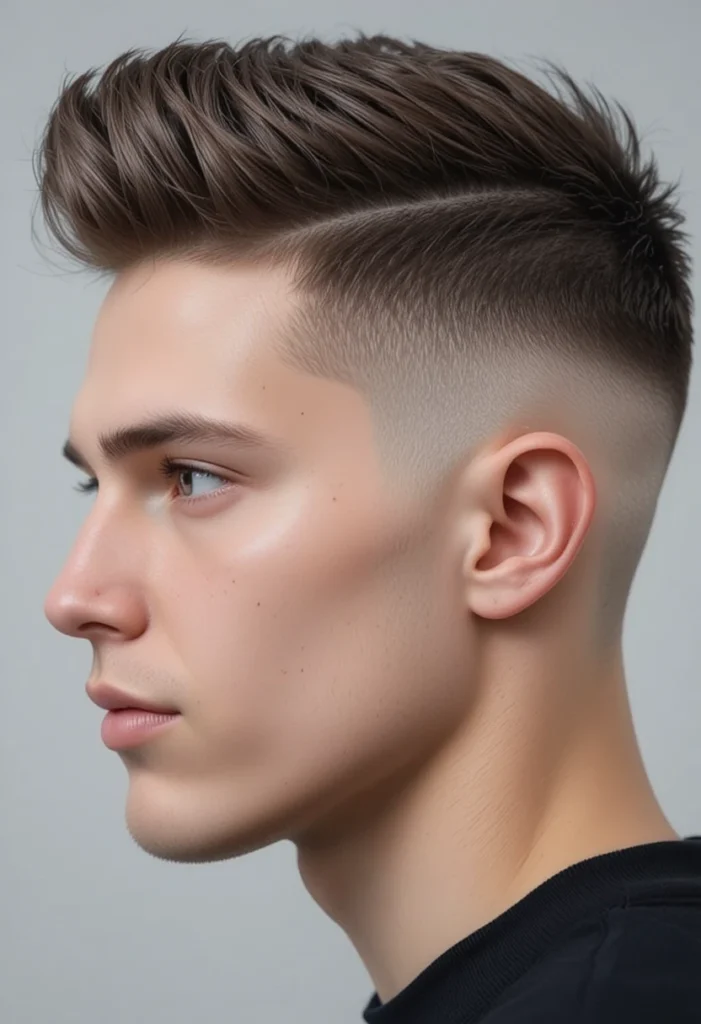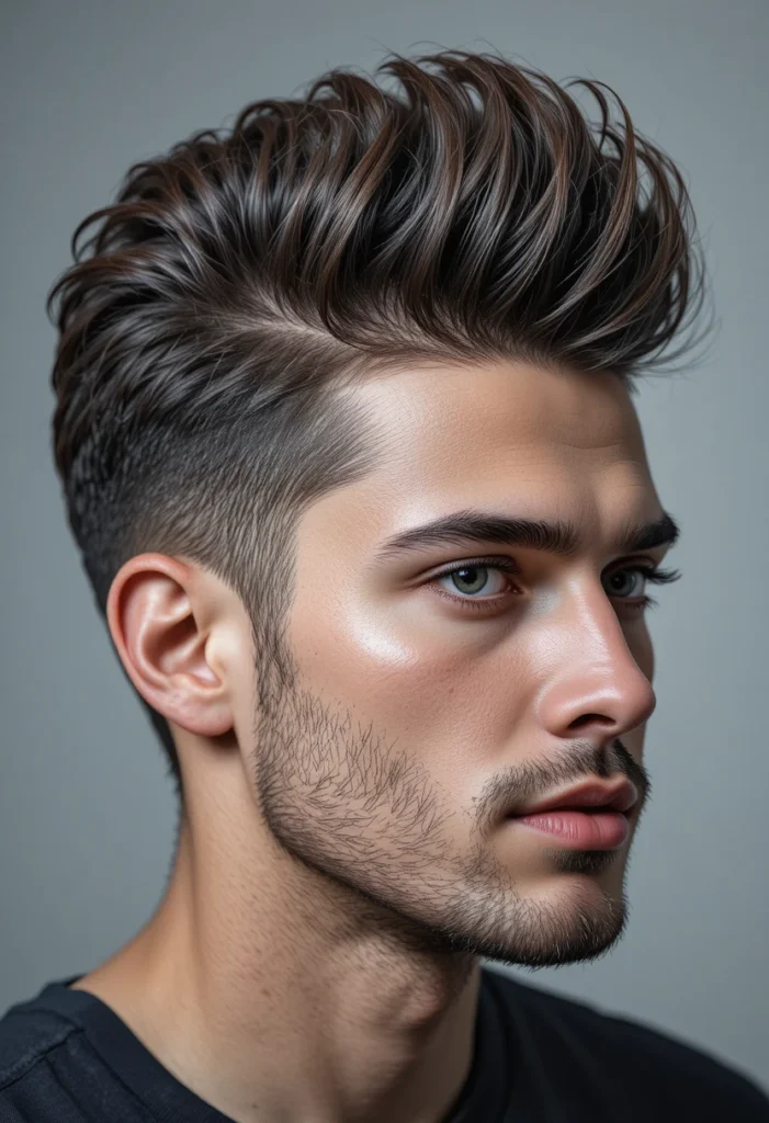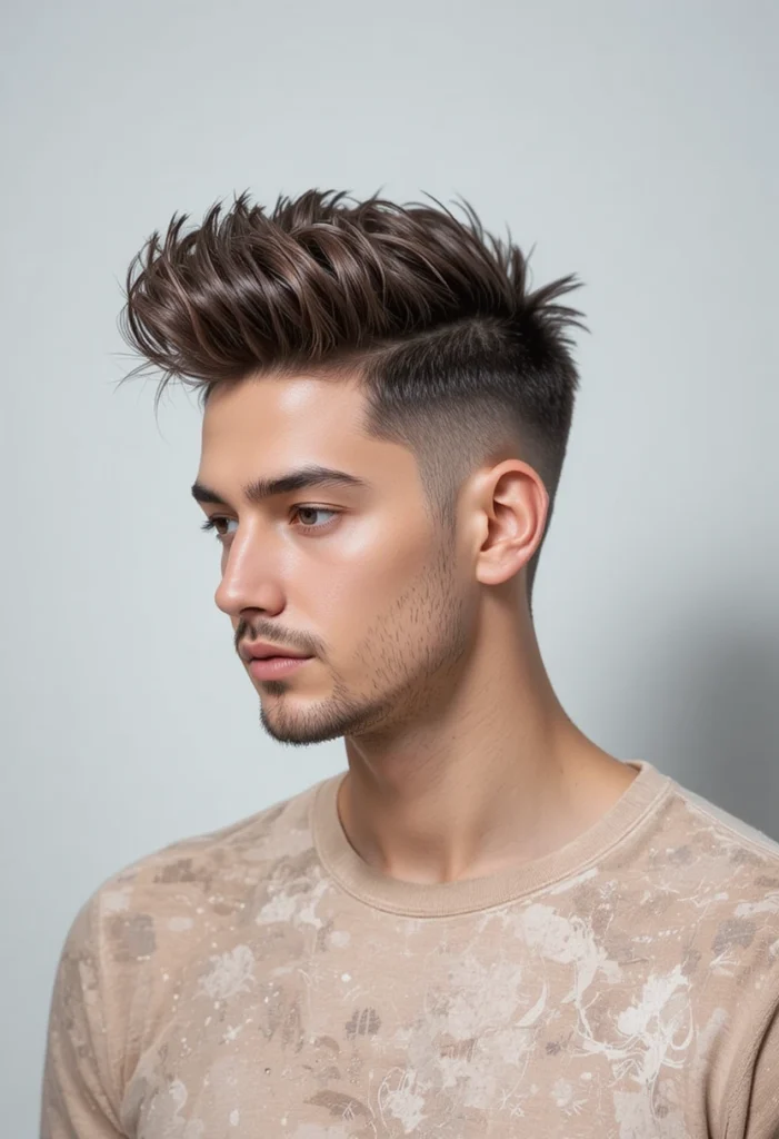 The brush-up hairstyle adds youthful energy and modern charm. The top hair is brushed upward and slightly backward, giving height and texture while keeping sides short and tidy. It’s a great blend of volume and control.
