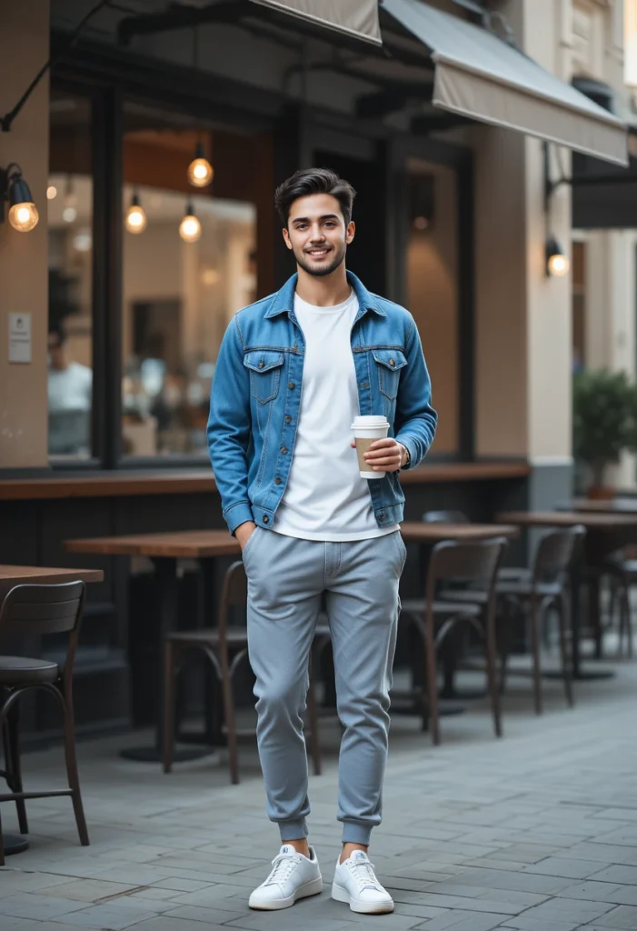 Go for black or grey joggers and white sneakers for contrast. Add a plain tee underneath to keep it simple. This combo works for city walks, quick errands, or casual evenings with friends.