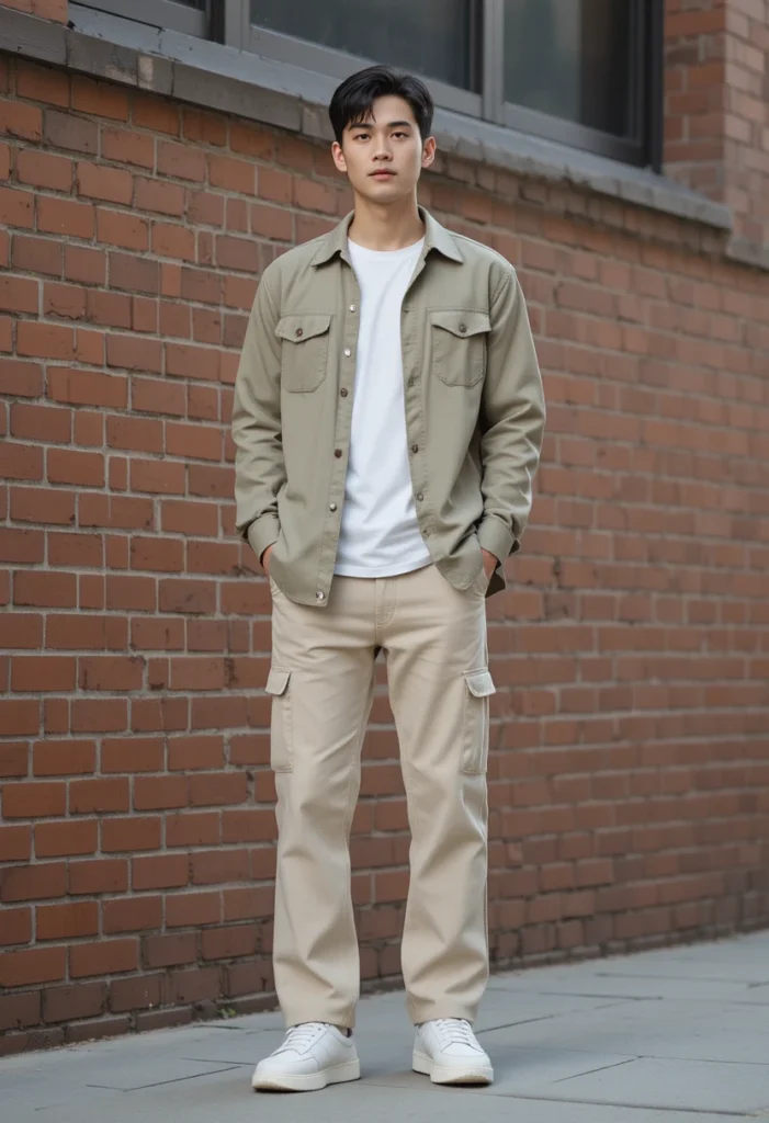 An overshirt layered over a t-shirt with wide-leg trousers gives off a trendy, urban vibe. It’s stylish yet comfortable, ideal for a modern streetwear aesthetic.