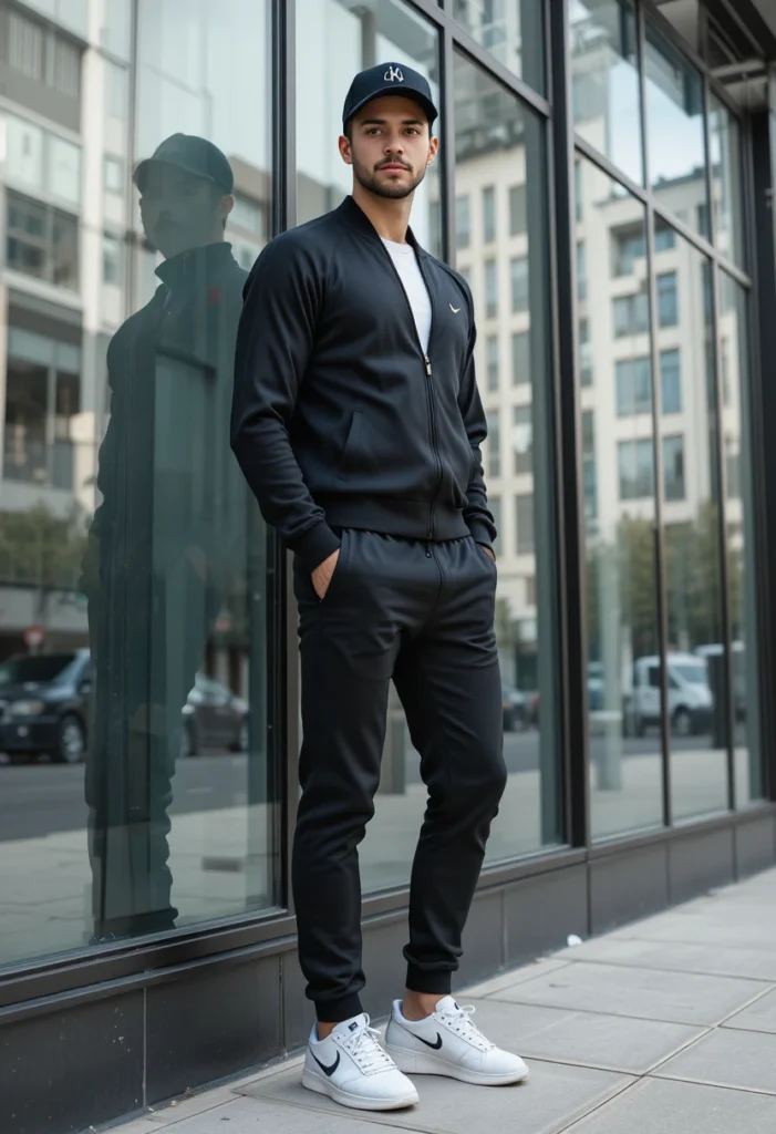 Pair your tracksuit with clean white sneakers and subtle accessories like a cap or watch. Go for solid colors like black, navy, or beige for that modern street edge.