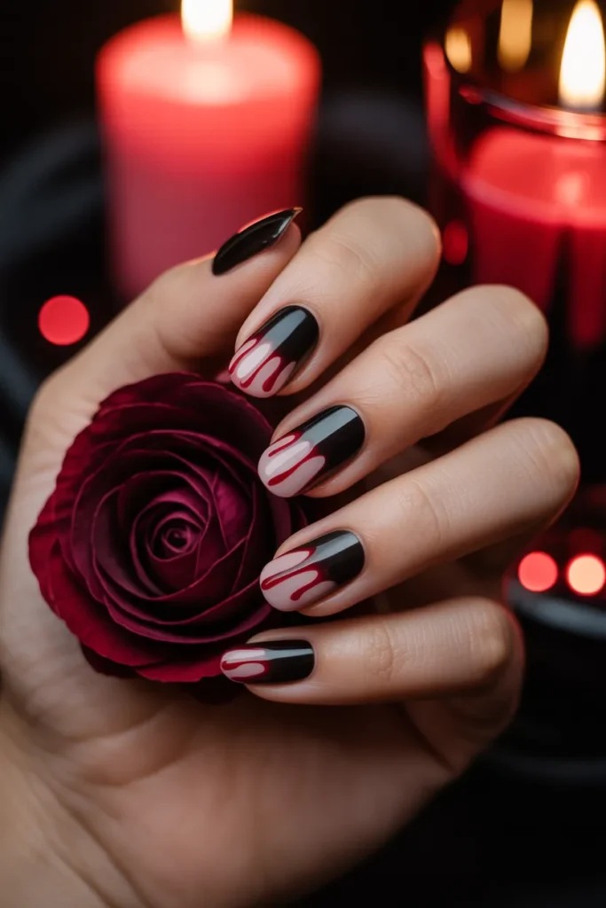 If you love a little drama, bloody drip nails are the way to go. Picture glossy red drips over nude or black bases — simple but spine-chilling. This design is both edgy and artistic, perfect for horror movie fans or vampire-themed parties.