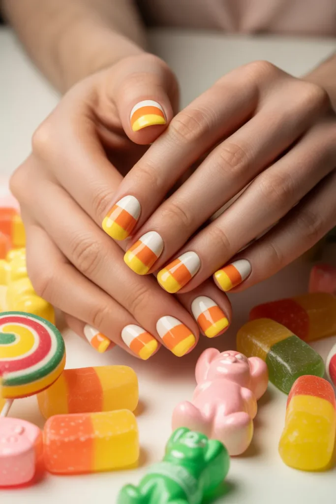 Fun twist: Try a French-tip version or a glossy 3D candy look. These nails pair perfectly with pumpkin patch outfits or family-friendly Halloween celebrations.