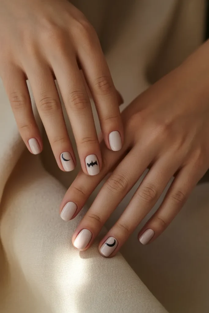 Not everyone loves bold or gory designs. Minimalist Halloween nails are sleek, subtle, and super trendy this year. Think nude bases with tiny black bats, a single ghost emoji, or mini crescent moons. It’s perfect for professionals or anyone who wants to celebrate Halloween in style without going overboard.
