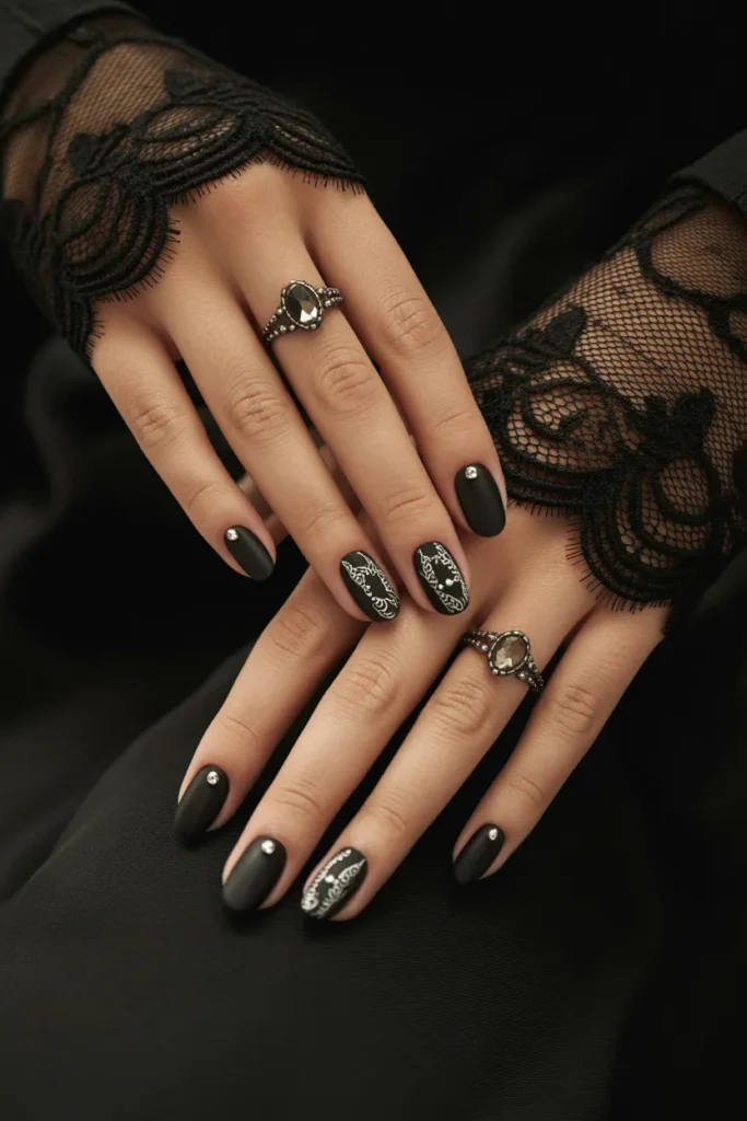 For the dark glamour lovers, gothic lace nails are stealing the show this Halloween. Matte black polish paired with lace-like stencils or fine white detailing creates an ultra-sophisticated spooky vibe. It’s elegant, mysterious, and works for both long and short nails.