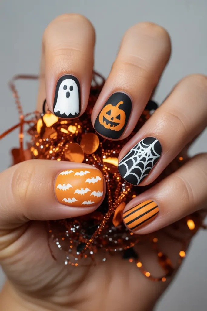 Can’t decide on just one look? Combine them! Mismatched Halloween nails are trending in 2025 because they’re creative, fun, and show off your personality. Mix ghosts, pumpkins, spiderwebs, and bats — each nail telling its own spooky story.