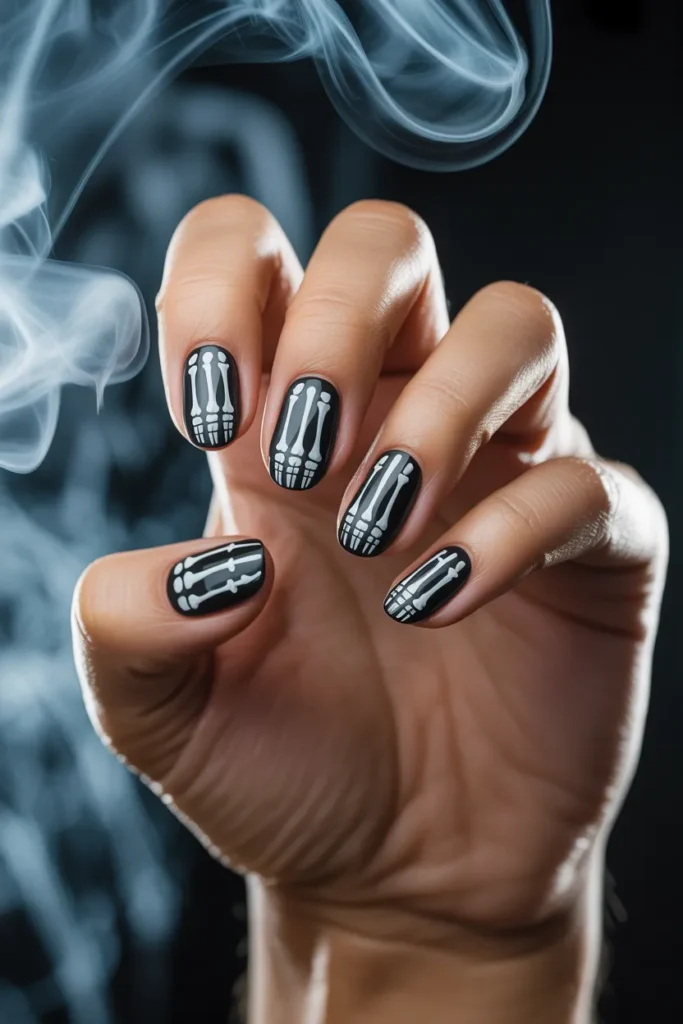 Skeleton nails are making a big comeback this year, but with a modern upgrade. Instead of flat designs, artists are adding depth using fine bone outlines and metallic highlights. Choose black as your base, and paint delicate white hand bones across a few accent nails for a realistic skeletal effect.