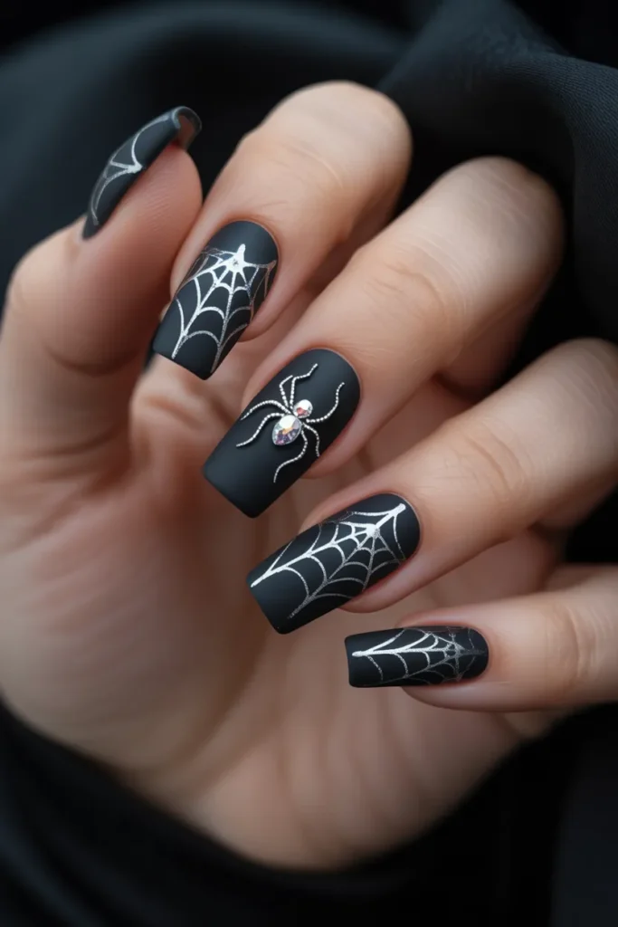 Spiderweb nail art is a Halloween staple — but in 2025, it’s going full glam. Instead of plain black webs, try metallic silver or glitter lines over matte bases. You can even add a tiny rhinestone “spider” on one accent nail to elevate the design.