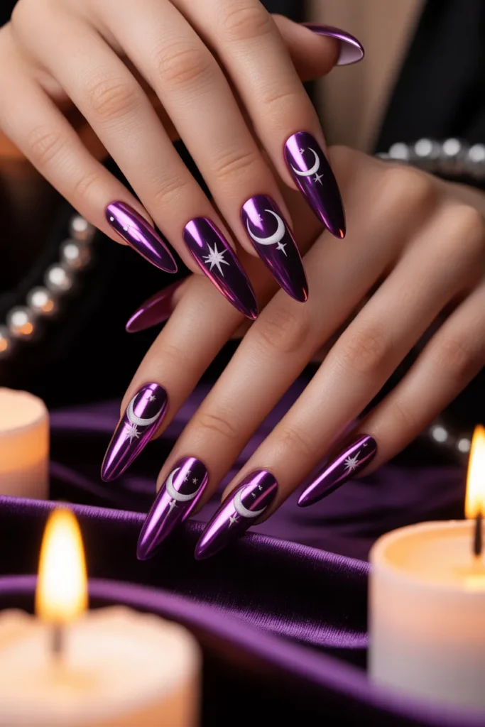 This year’s biggest trend? Witchy metallics. Think deep purples, emerald greens, or dark silvers with a reflective chrome finish. Add crescent moon decals or constellation accents for that mystical witch-core aesthetic.